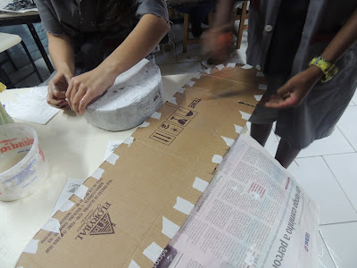 A criação de uma coruja foi o nosso desafio do primeiro semestre.Criamos uma coruja utilizando-se de material de descarte e papietagem. A solução foi o uso de embalagens da Tetra Pak, recortadas e papietadas com 4 camadas. As caixas foram lavadas, secas e enchidas com pedrinhas de cascalho para terem mais firmeza. Quanto a arte final optamos por colagem de papel colorido ao invés da pintura.